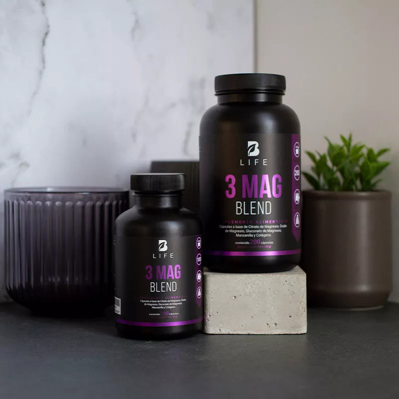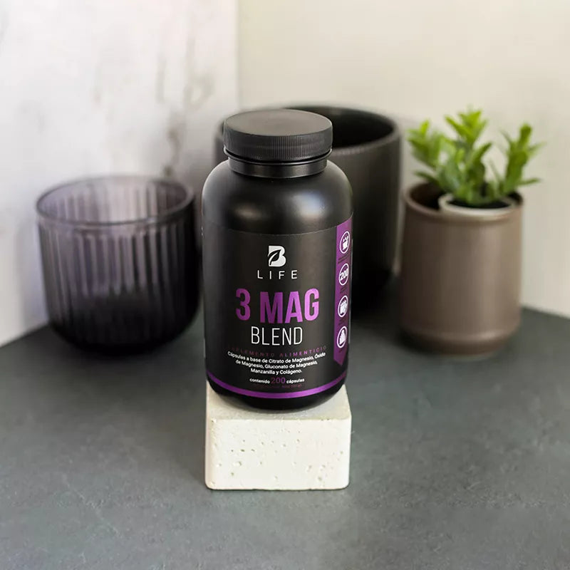¡Descubre el bienestar con 3 Mag Blend B Life®! Nuestra excepcional mezcla de tres formas altamente absorbentes del Magnesio: Citrato, Óxido y Gluconato, ofrece una alta absorción y biodisponibilidad en el organismo gracias a su concentración máxima de 500 mg por cápsula. Además de estar enriquecida con Manzanilla y Colágeno Hidrolizado, nutrientes que potencian los beneficios del Magnesio y que otras fórmulas carecen.