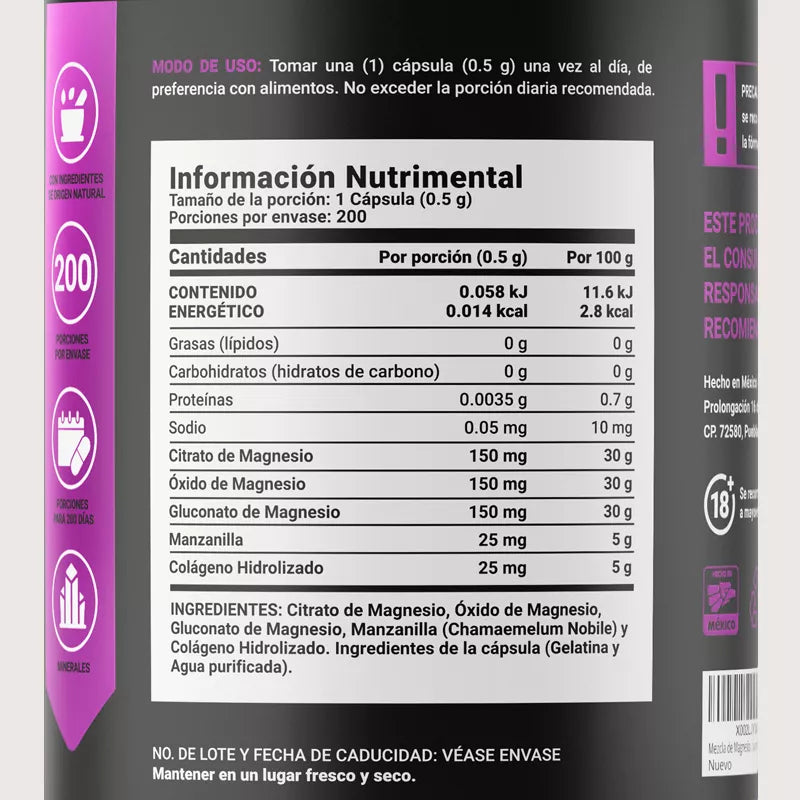 ¡Descubre el bienestar con 3 Mag Blend B Life®! Nuestra excepcional mezcla de tres formas altamente absorbentes del Magnesio: Citrato, Óxido y Gluconato, ofrece una alta absorción y biodisponibilidad en el organismo gracias a su concentración máxima de 500 mg por cápsula. Además de estar enriquecida con Manzanilla y Colágeno Hidrolizado, nutrientes que potencian los beneficios del Magnesio y que otras fórmulas carecen.