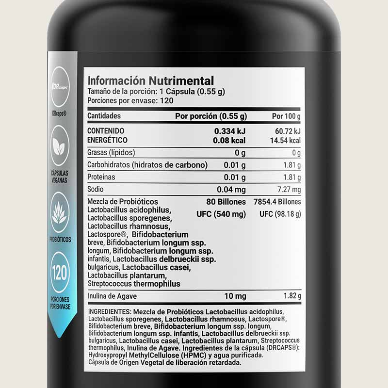 Cada cápsula de 550 mg está diseñada para aportar una poderosa concentración de 11 cepas de probióticos e Inulina de Agave, ingredientes valiosos para tu bienestar.