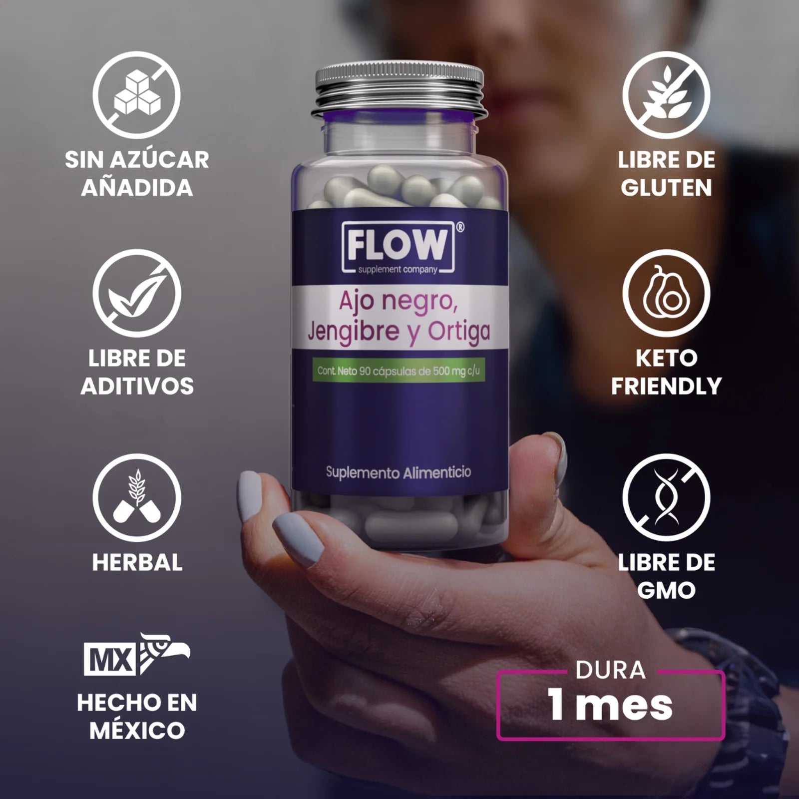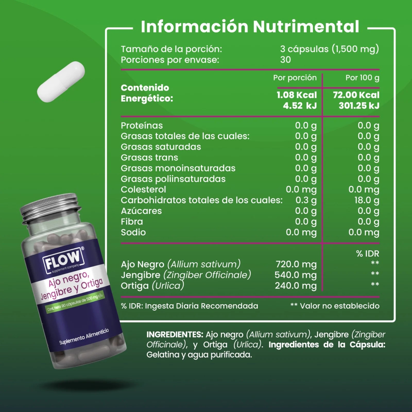 Fórmula mejorada a base de: Ajo Negro (Allium Sativum), Jengibre (Zingiber Officinale) y Ortiga (Urlica). Es libre de aditivos y Gluten free.