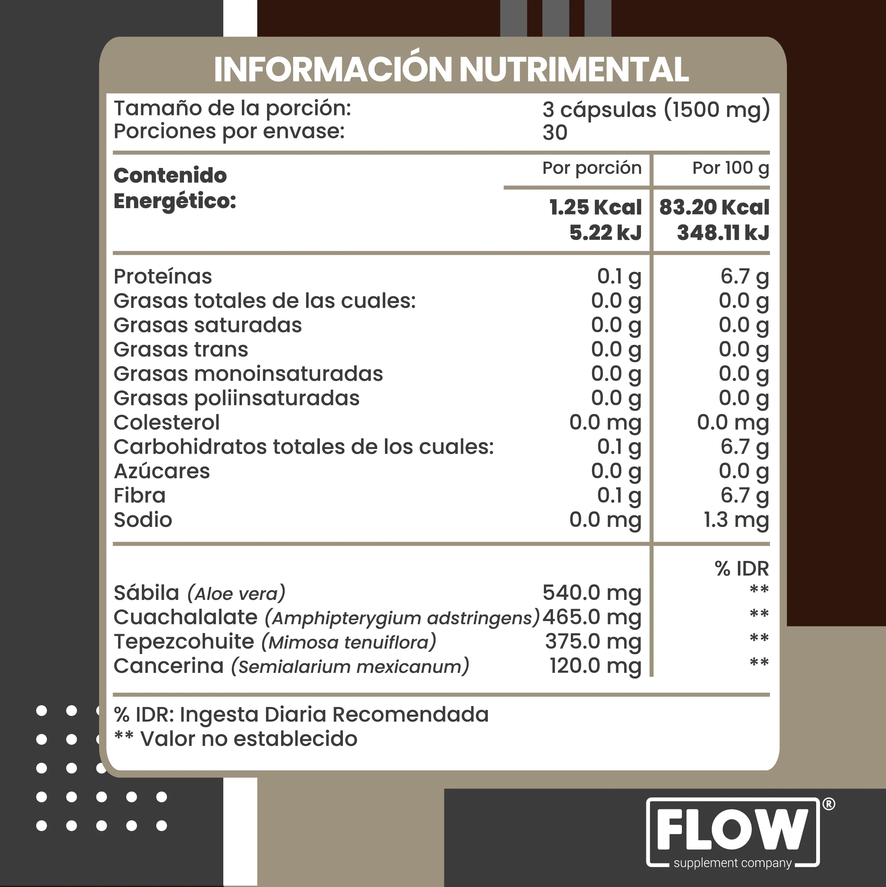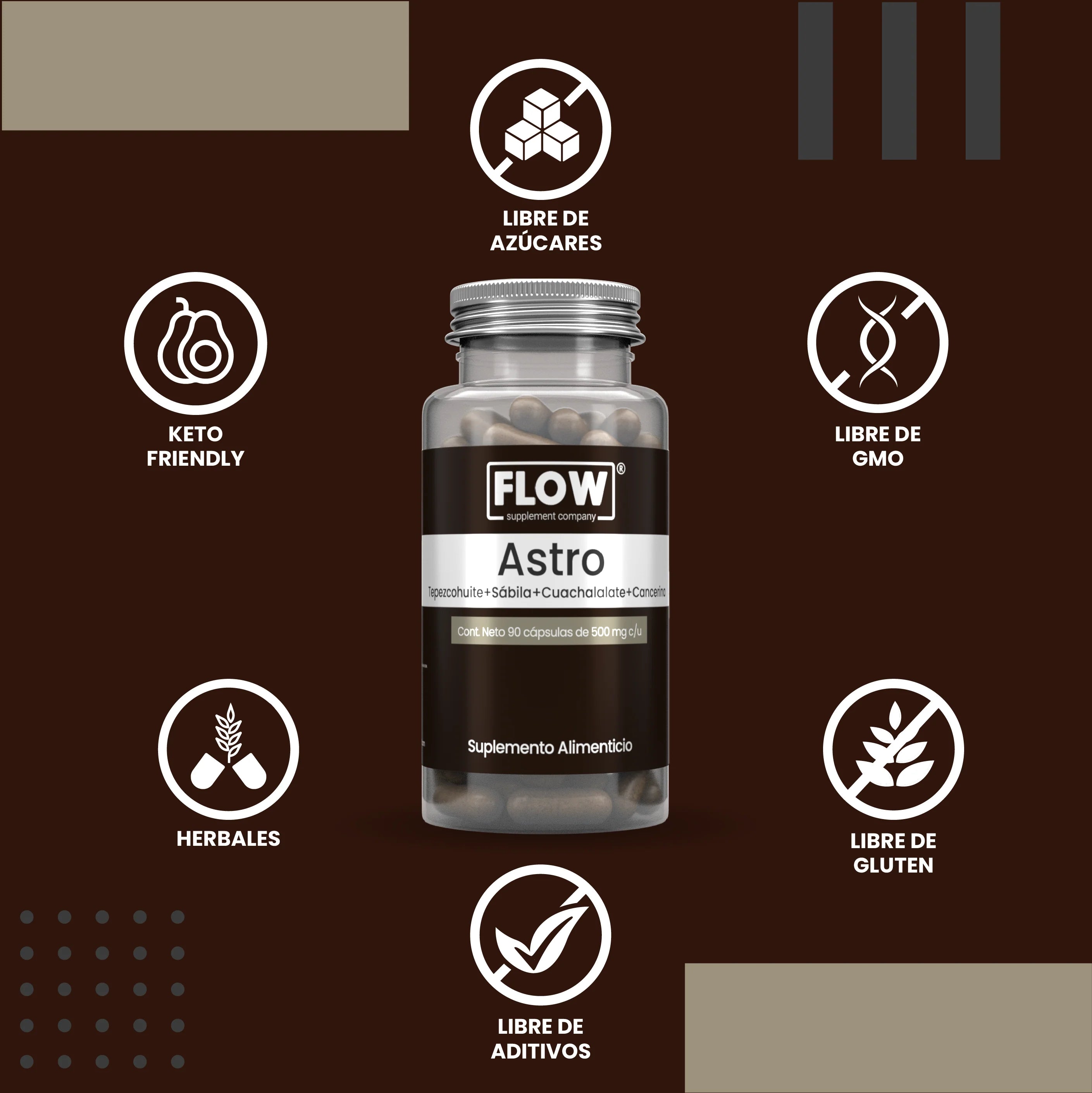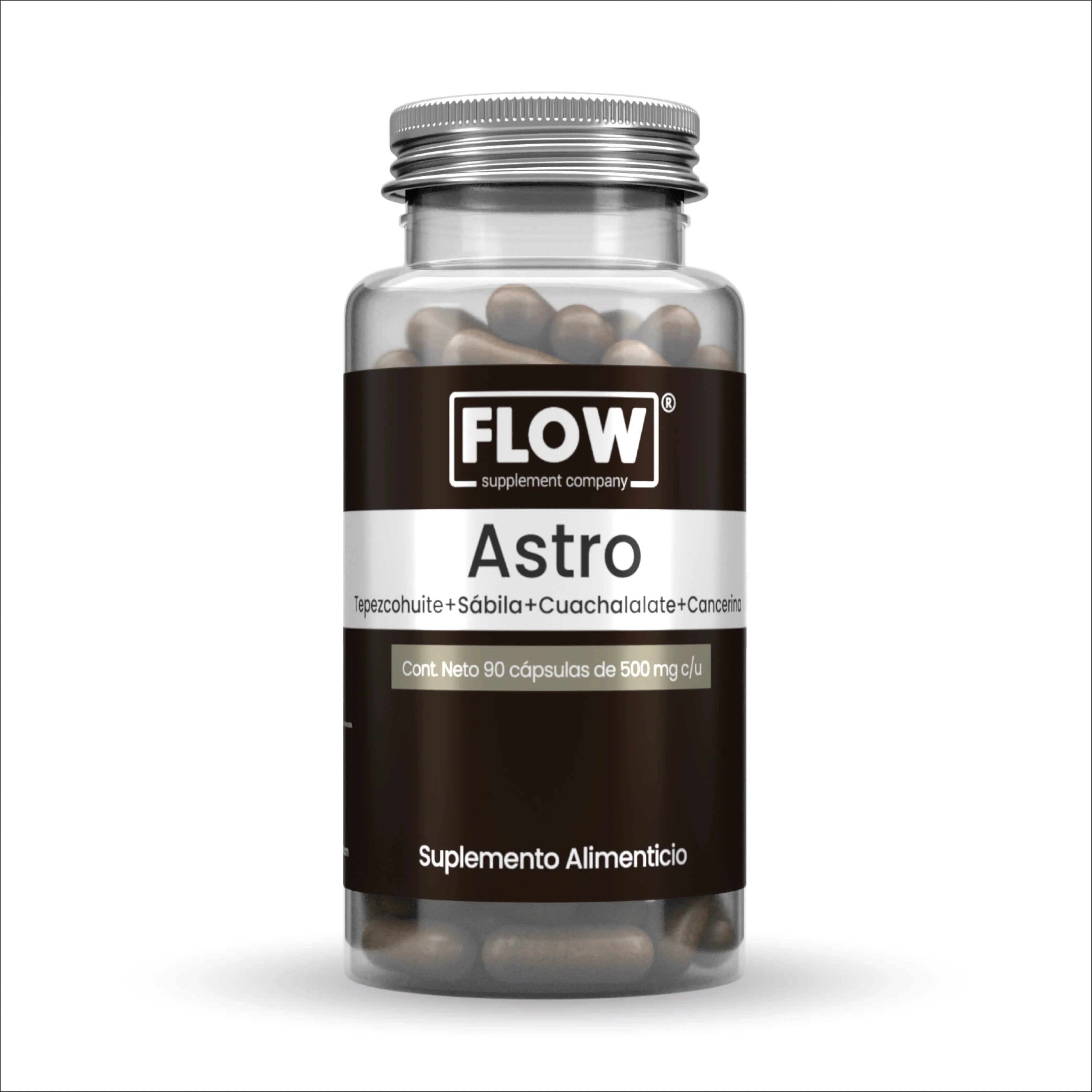 Suplemento de origen 100% natural, fórmula a base de plantas: Tepezcohuite, Sábila, Cuachalalate y Cancerina. Astro de FLOW, es libre de aditivos y Gluten free.