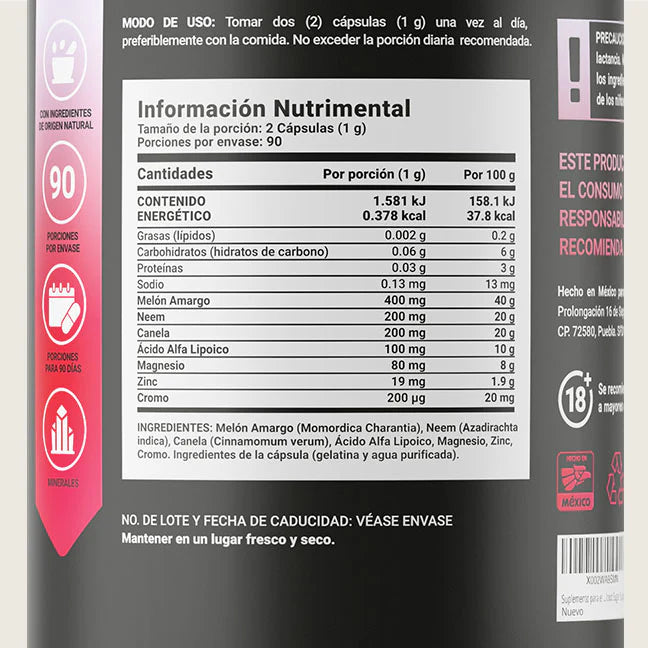 ¡Disfruta la formulación de BSS B Life®! Cada cápsula de 500 mg está diseñada para aportar una asombrosa concentración de Melón Amargo, Neem, Canela, Ácido Alfa Lipoico, Magnesio, Zinc y Cromo. Esta composición es una mezcla selecta de nutrientes sinérgicos que ninguna otra presentación ofrece.