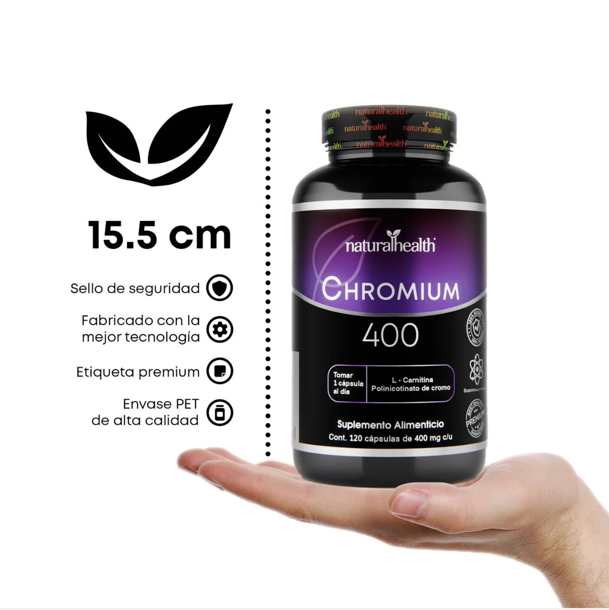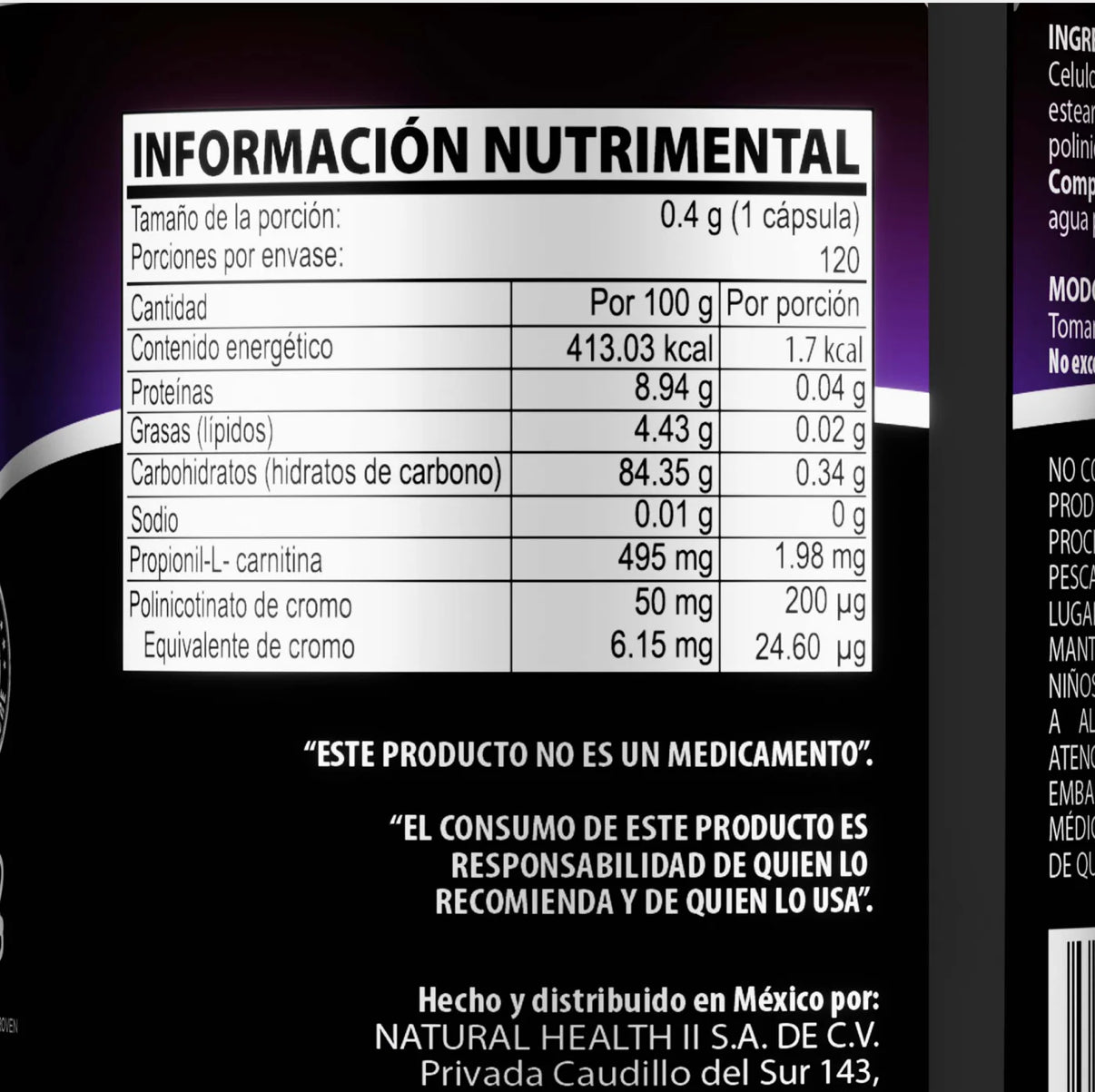 Chromium 400 es un suplemento diseñado para ayudarte a alcanzar tus objetivos fisicos y mejorar tu composición corporal. Cada cápsula contiene una combinación efectiva de L-carnitina y picolinato de cromo, nutrientes esenciales que trabajan en sinergia para optimizar energiaa y promover una composicion corporal sana.