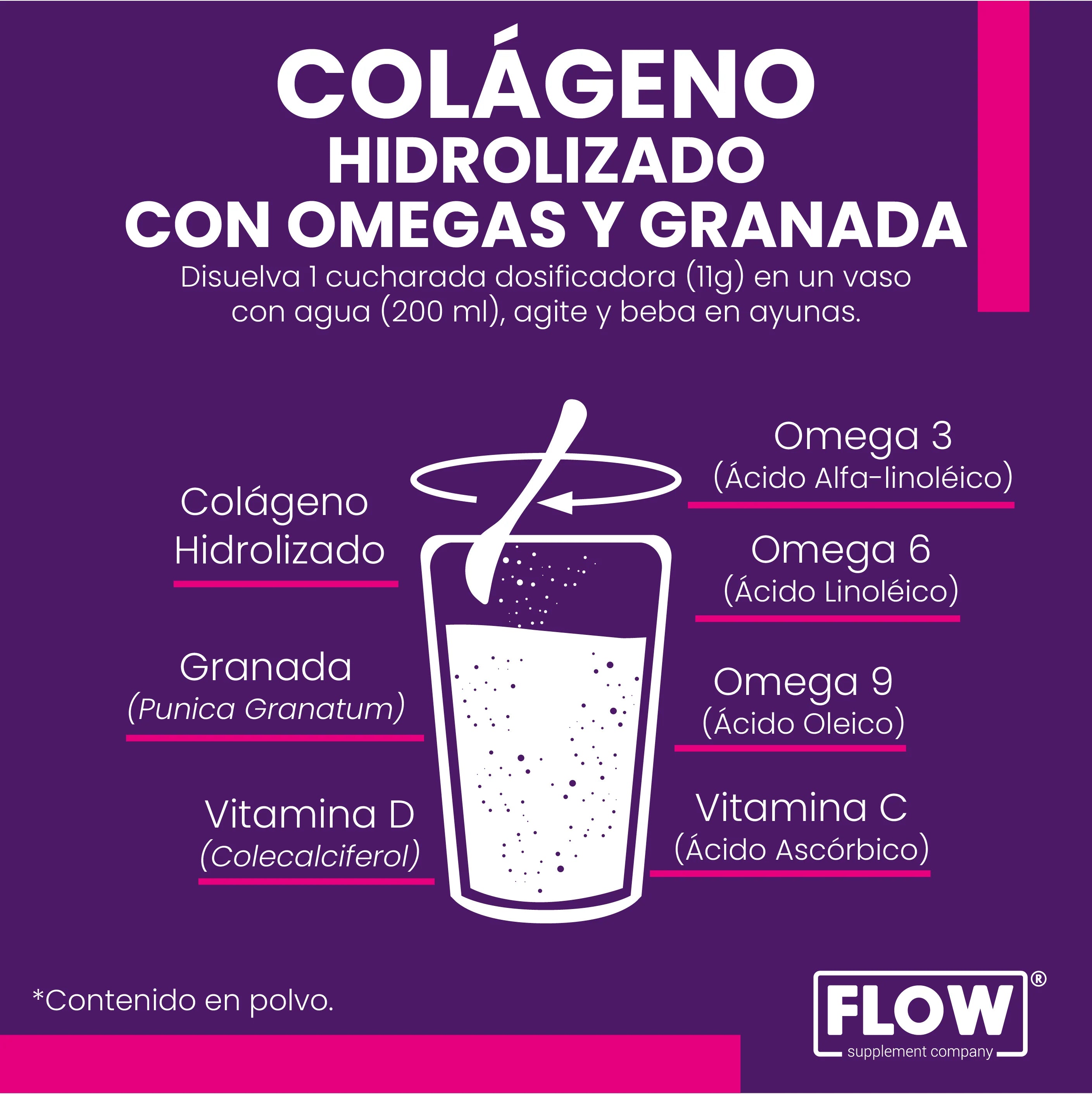 Este colágeno, es constituido por 90% de colágeno y adicionado con Omegas y Granada. Presentación en bolsa de 330 gramos. Es libre de gluten y de aditivos y azúcar.