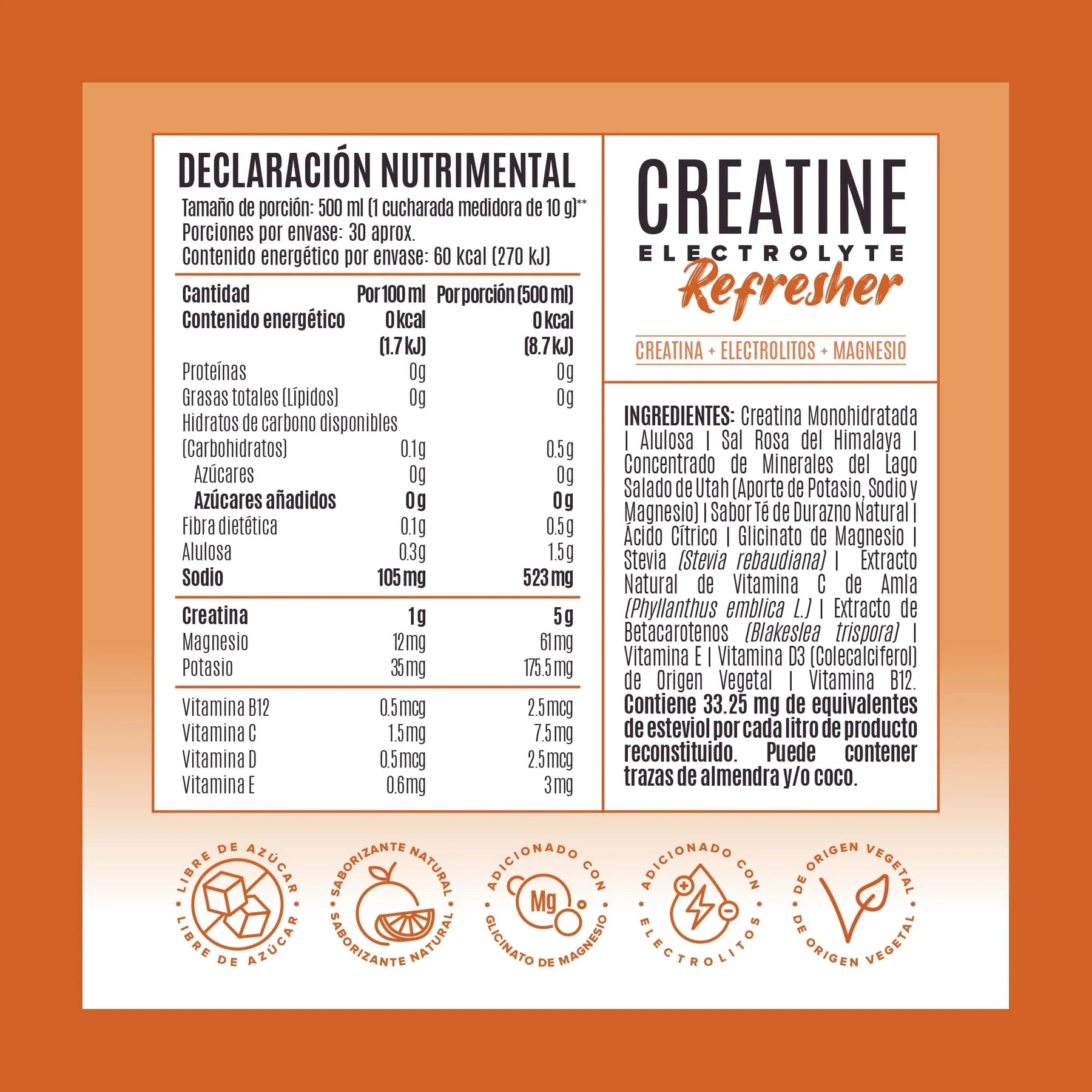 Creatine Electrolyte Refresher es la forma más refrescante y deliciosa de incorporar creatina a tu vida, combinando 5g de creatina monohidratada pura por porción con una mezcla exclusiva de electrolitos esenciales y glicinato de magnesio.