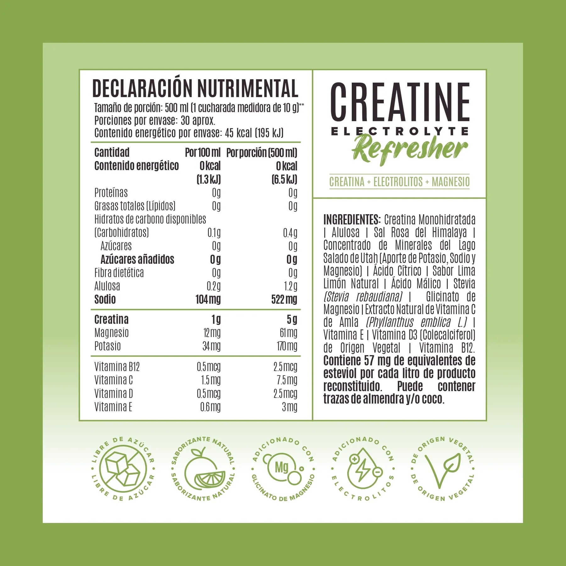 Creatine Electrolyte Refresher es la forma más refrescante y deliciosa de incorporar creatina a tu vida, combinando 5g de creatina monohidratada pura por porción con una mezcla exclusiva de electrolitos esenciales y glicinato de magnesio.