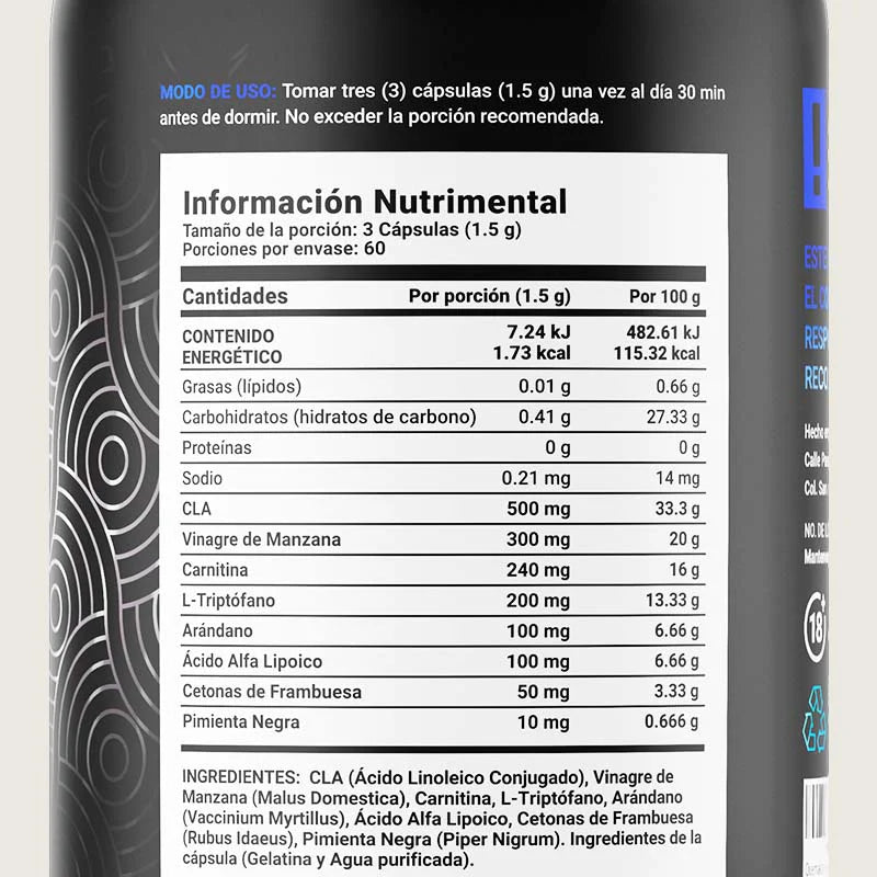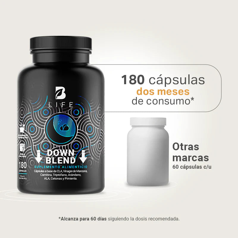 ¡Despierta más ligero con Down Blend B Life®! Cada cápsula de 500 mg presenta una combinación única de CLA (Ácido Linoleico Conjugado), Vinagre de Manzana, Carnitina, Arándano, Ácido Alfa Lipoico, Cetonas de Frambuesa y Pimienta Negra, una mezcla de aminoácidos y antioxidantes naturales.