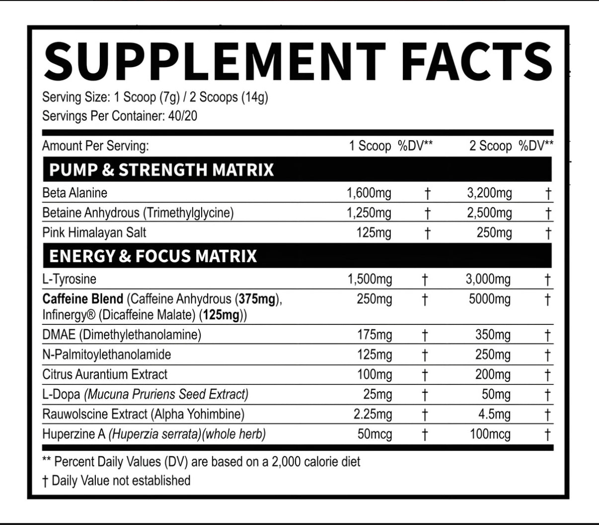 Formulado para ser un catalizador sin BS, de energía de alta intensidad y de conducción de enfoque, Venom® no deja nada al azar, abordando todos los ángulos de optimización de su potencial de rendimiento. Con energía de alta intensidad impulsada por 375 mg de cafeína anhidra y 50 mg de Infinergy® (malato de dicafeína) y un enfoque impulsado aún más por una combinación sinérgica de L-tirosina y huperzina, estarás encerrado para aplastar cada entrenamiento.