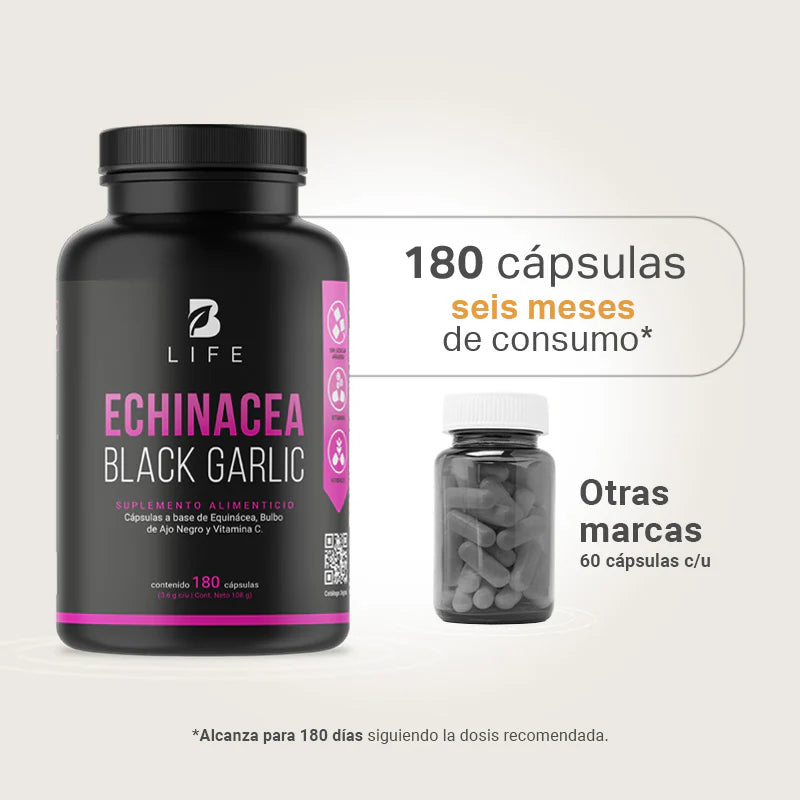 ¡Echinacea Black Garlic B Life®, tu protección natural! Cada cápsula de 600 mg contiene una combinación poderosa de Equinácea, Bulbo de Ajo Negro y Vitamina C, ofreciendo propiedades antioxidantes y un apoyo incomparable para tu bienestar. Una formulación única que no encontrarás en otras presentaciones.