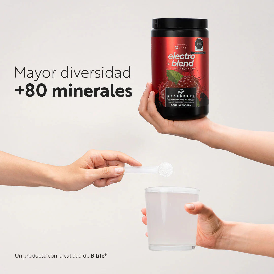 ¡Electroblend B Life®, hidratación real, hidratación para todos! Revitalízate con una combinación de electrolitos sin azúcares añadidos. Cada porción de 6 gramos proporciona más de 80 minerales esenciales con solo 0.40 kcal.