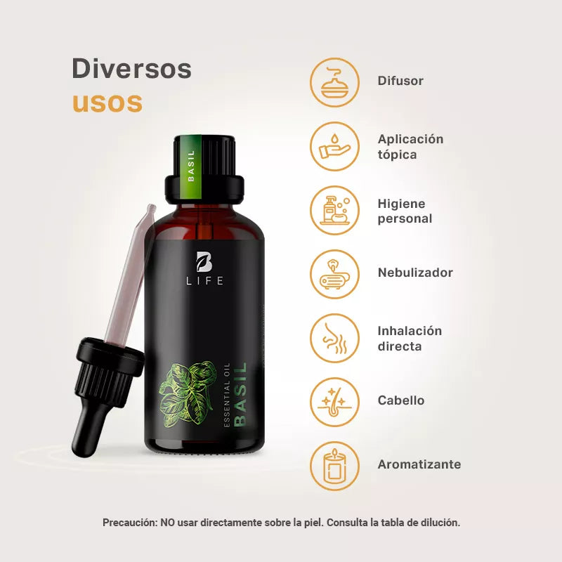 Basil (Albahaca) Essential Oil B Life® es un producto 100% Puro y Natural con numerosas propiedades derivadas de su activo, que ayudan a mitigar la migraña, picadura de insectos, tensión muscular, dolor estomacal, cólicos menstruales, entre otros. A diferencia de otros productos que solo contienen 10 y 15 ml, Essential Oil contiene 50 ml.