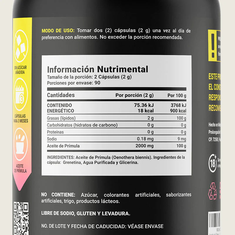 ¡Evening Primrose B Life®, tu bienestar natural! Nuestra fórmula exclusiva contiene una concentración máxima de 2000 mg de Aceite de Prímula por porción, superando a otras opciones que ofrecen solo 1460 mg de este activo clave para tu vitalidad.