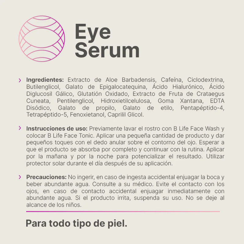 Calidad en el cuidado de tus ojos con nuestro Eye Serum de 30 ml. Diseñado para combatir las arrugas, manchas y bolsas en el contorno de los ojos, esta fórmula con un 96% de ingredientes naturales es adecuada para todos los tipos de piel.