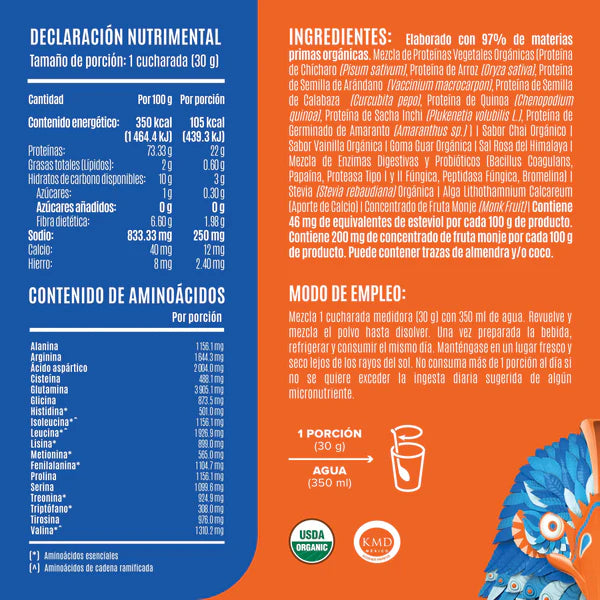 Cada porción de 30 g aporta hasta 24 g de proteína vegetal, es libre de azúcares, gluten, soya y posee certificados USDA Organic y Kosher.
