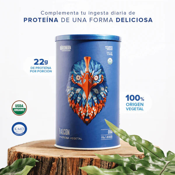 Falcon Protein está diseñada para apoyar tu ingesta de nutrientes diarios y está disponible en sabores orgánicos de chocolate, vainilla, chai, natural y fresa.