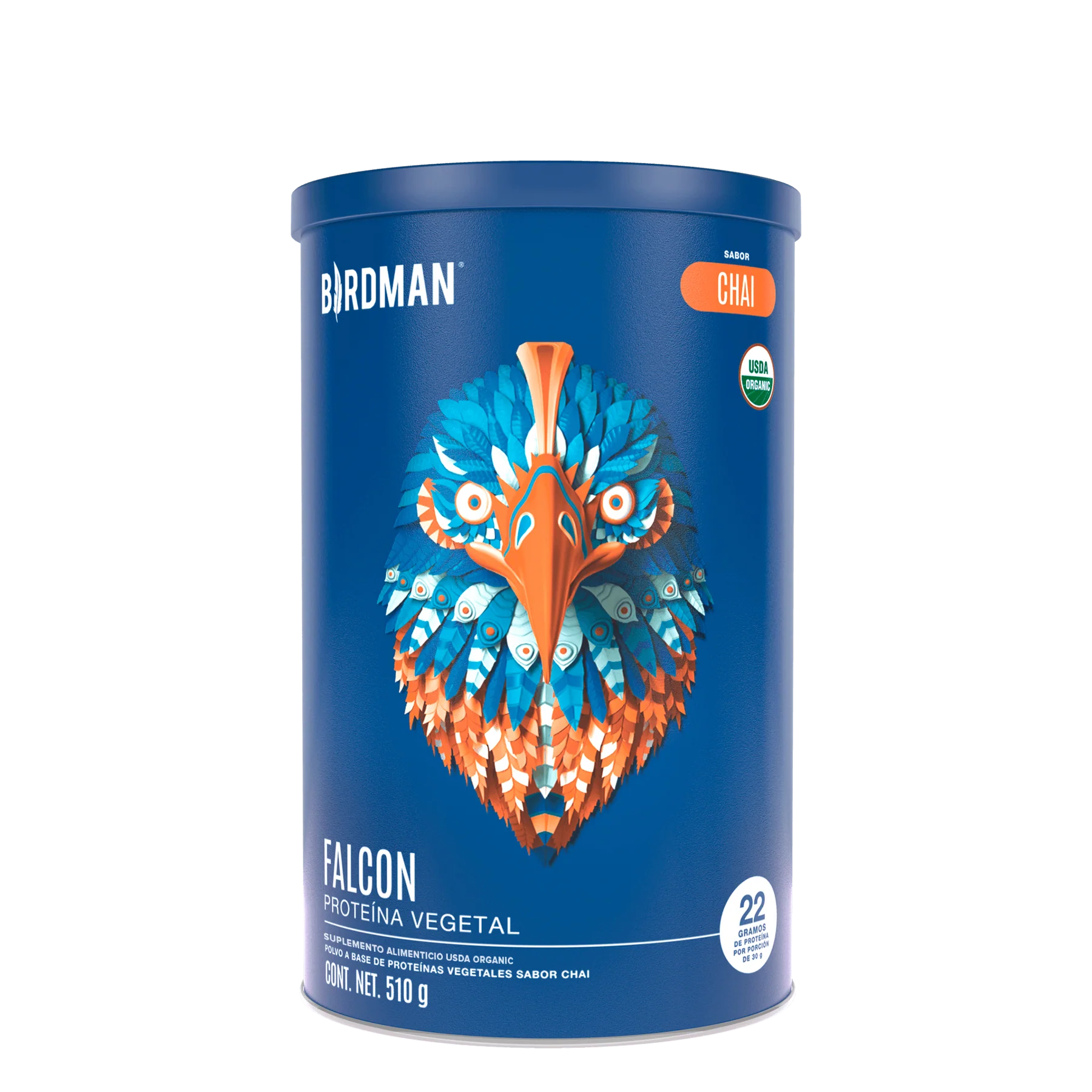 Falcon Protein está diseñada para apoyar tu ingesta de nutrientes diarios y está disponible en sabores orgánicos de chocolate, vainilla, chai, natural y fresa.
