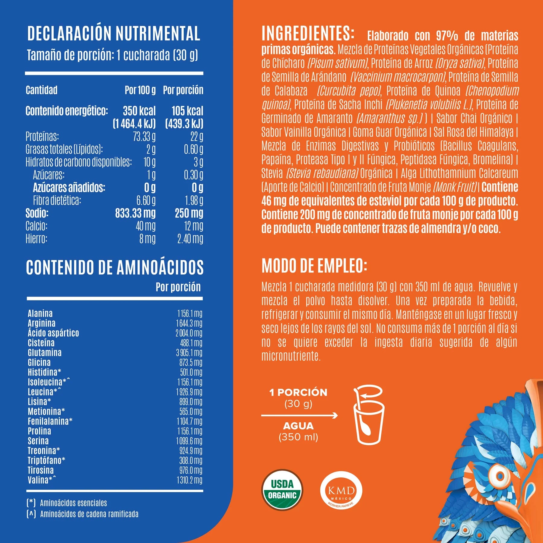 Cada porción de 30 g aporta hasta 24 g de proteína vegetal, es libre de azúcares, gluten, soya y posee certificados USDA Organic y Kosher.