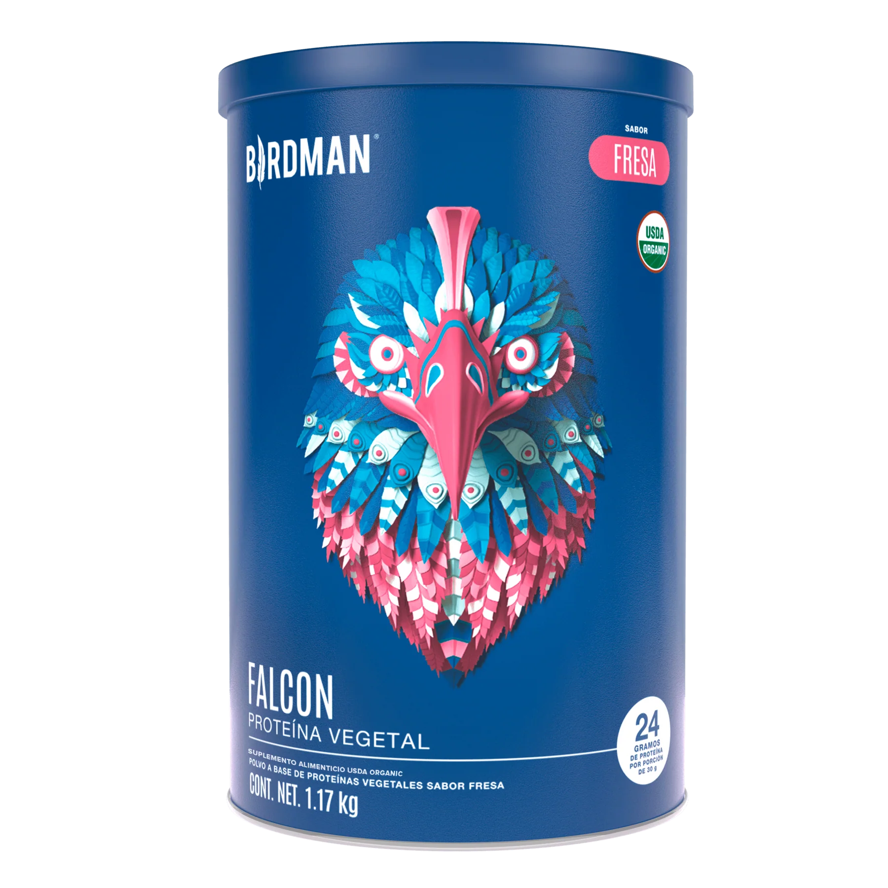 Falcon Protein está diseñada para apoyar tu ingesta de nutrientes diarios y está disponible en sabores orgánicos de chocolate, vainilla, chai, natural y fresa.