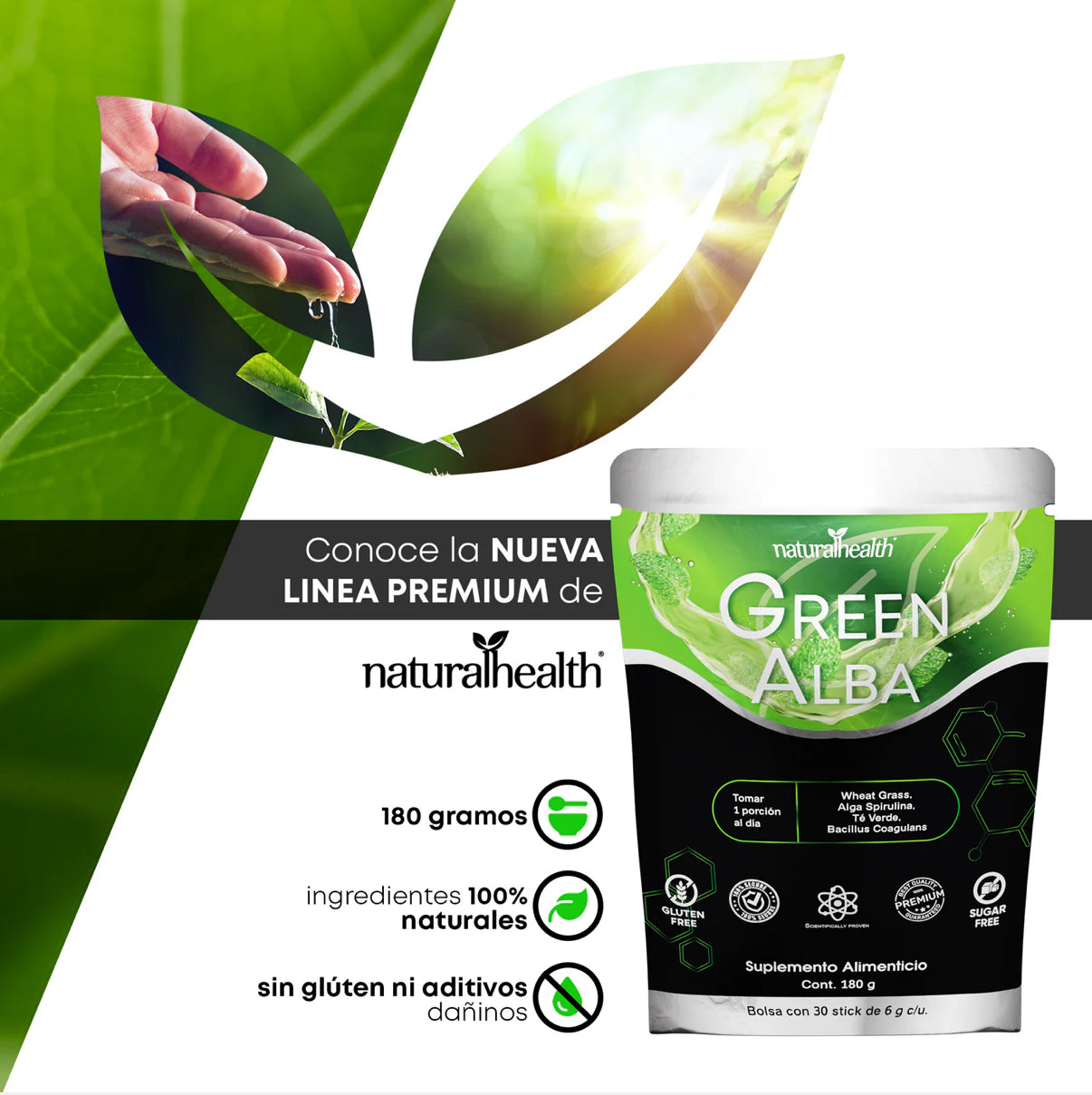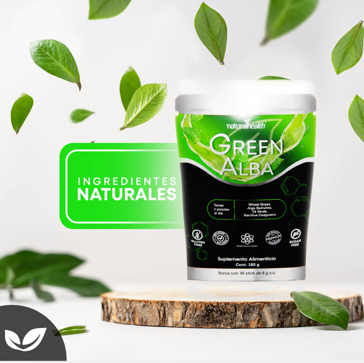 Green Alba es un superalimento en polvo, diseñado para brindarte una dosis concentrada de nutrientes esenciales y antioxidantes. Cada sobre contiene una combinación única de ingredientes naturales como wheatgrass, piña, alfalfa, té verde, espirulina, inulina de agave, jengibre, papaína y lactobacilos, que trabajan en sinergia para mejorar tu salud y bienestar.