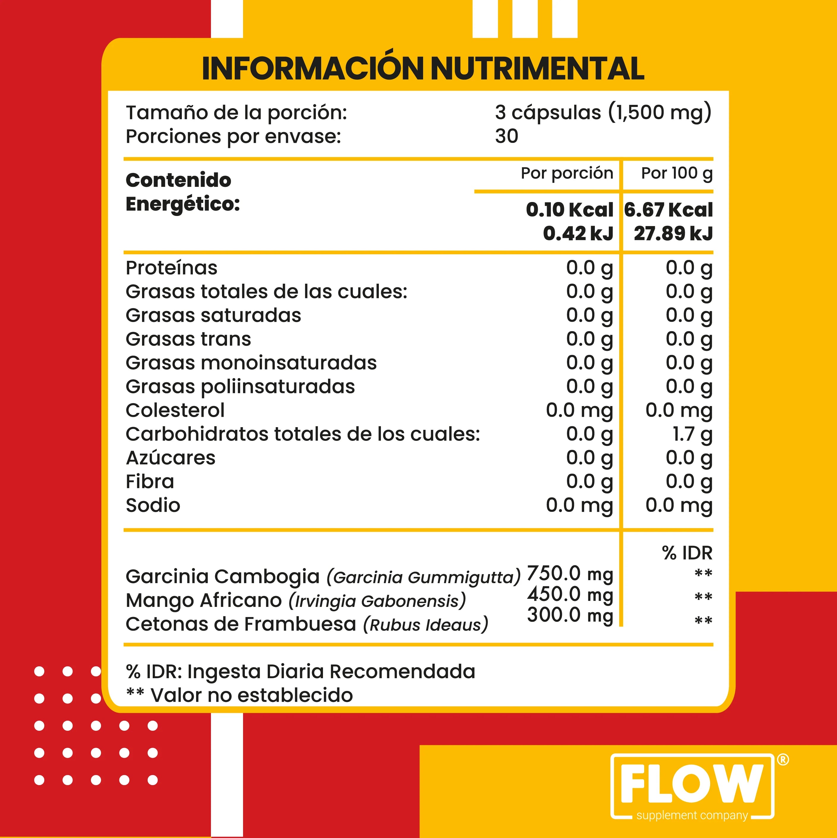 Mango africano, Cetonas de frambuesa y Garcinia cambogia. Cápsula de gelatina blanda. Presentación de 90 cápsulas. Es libre de aditivos y Gluten free.