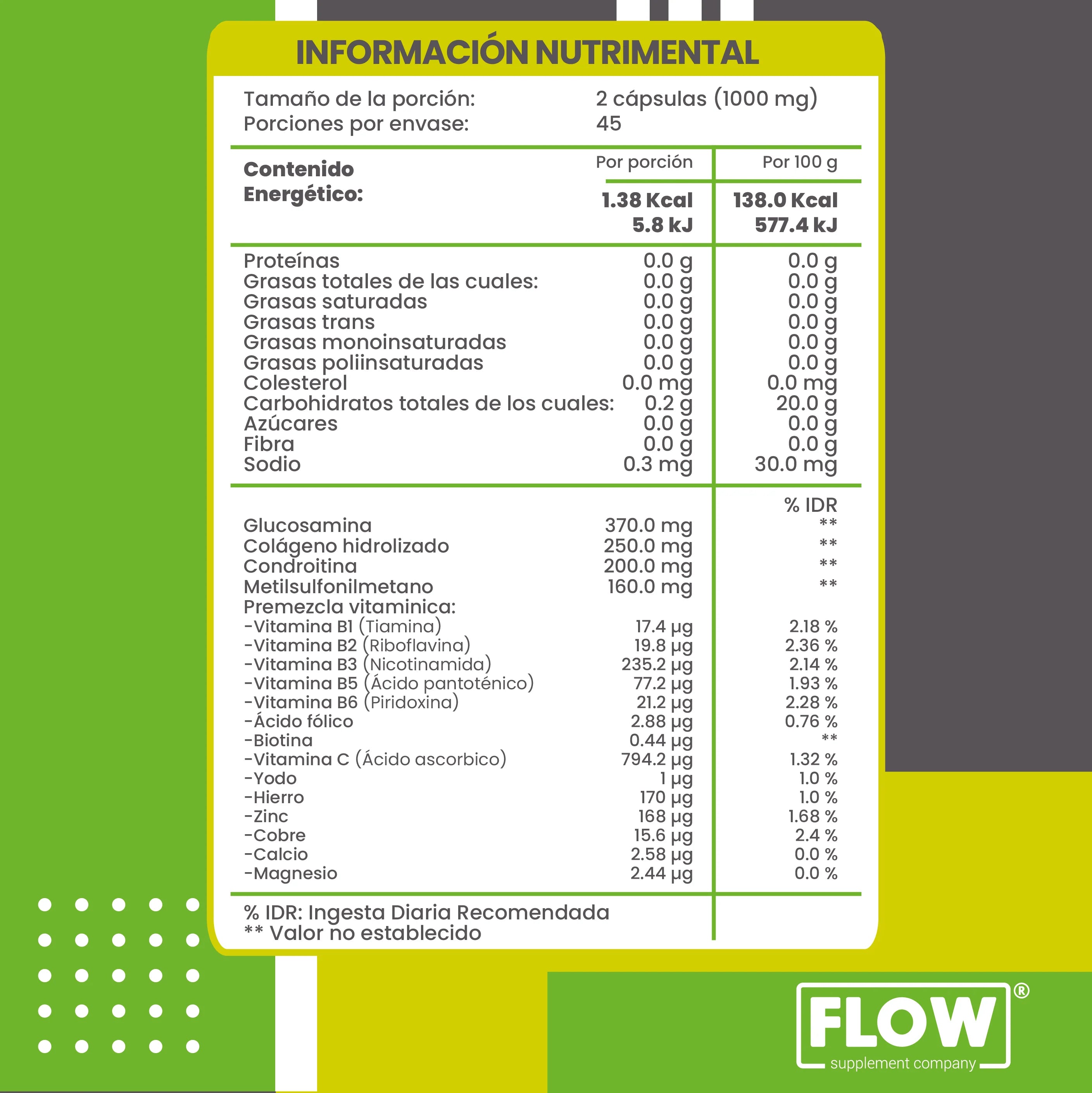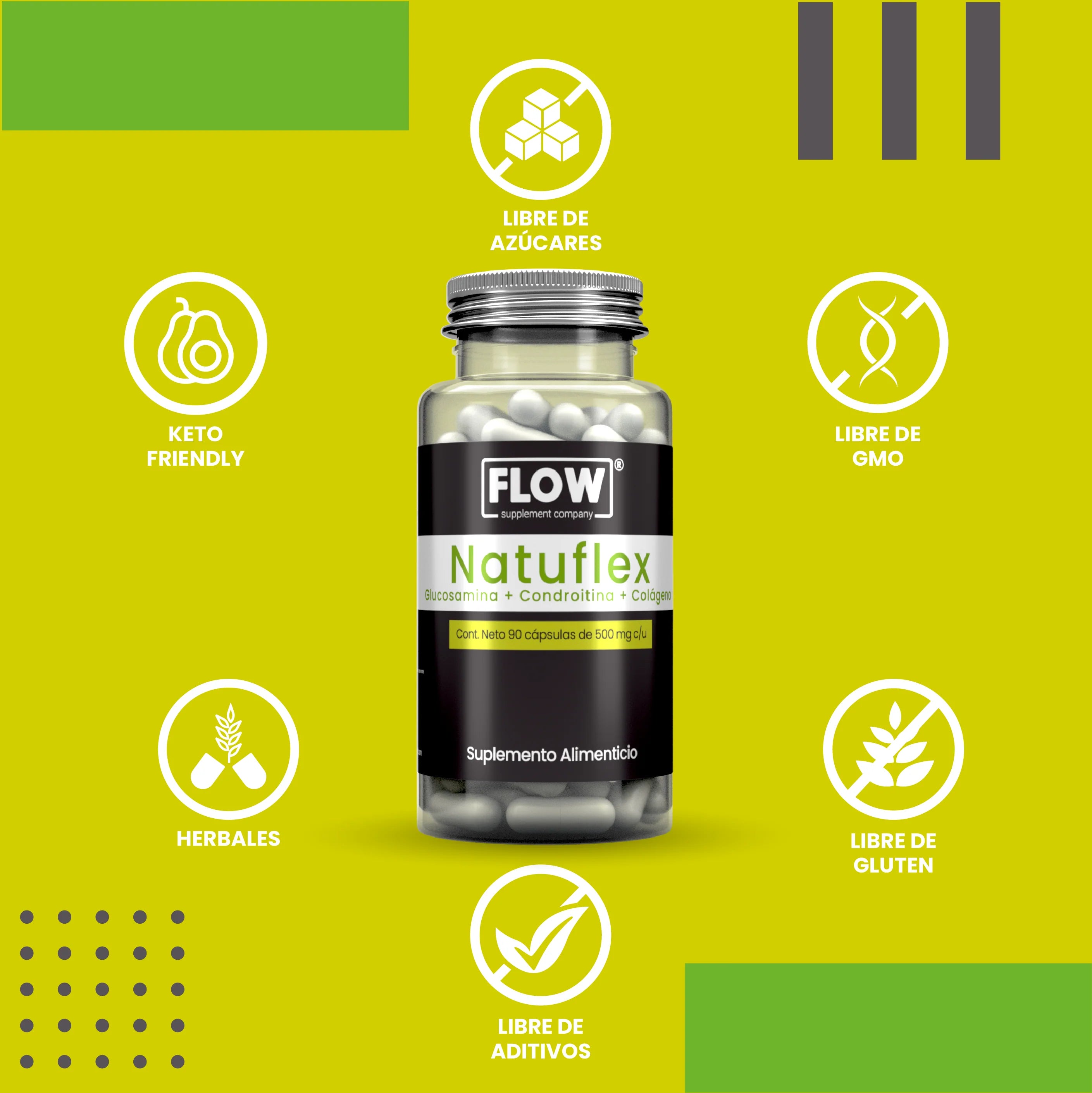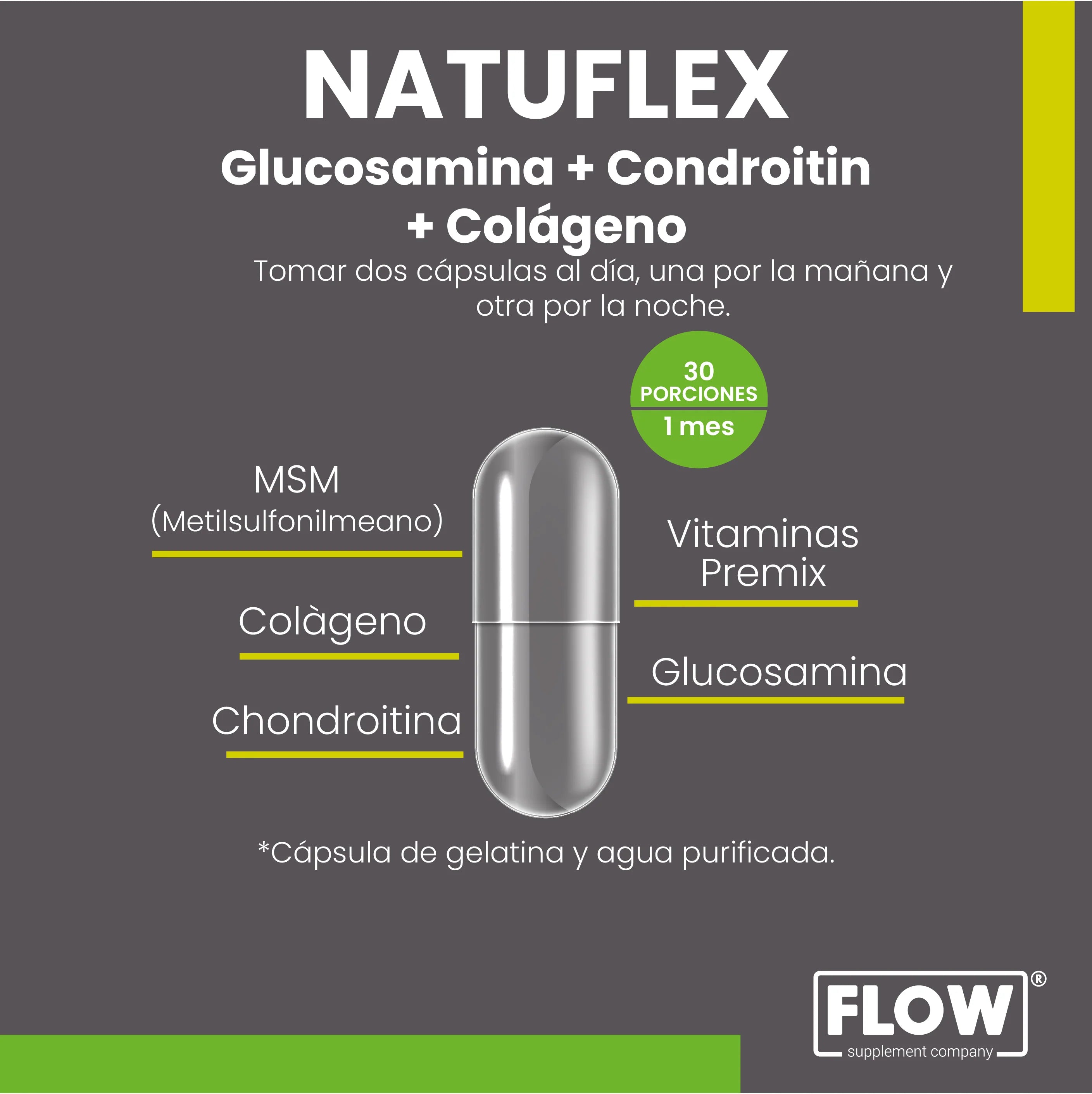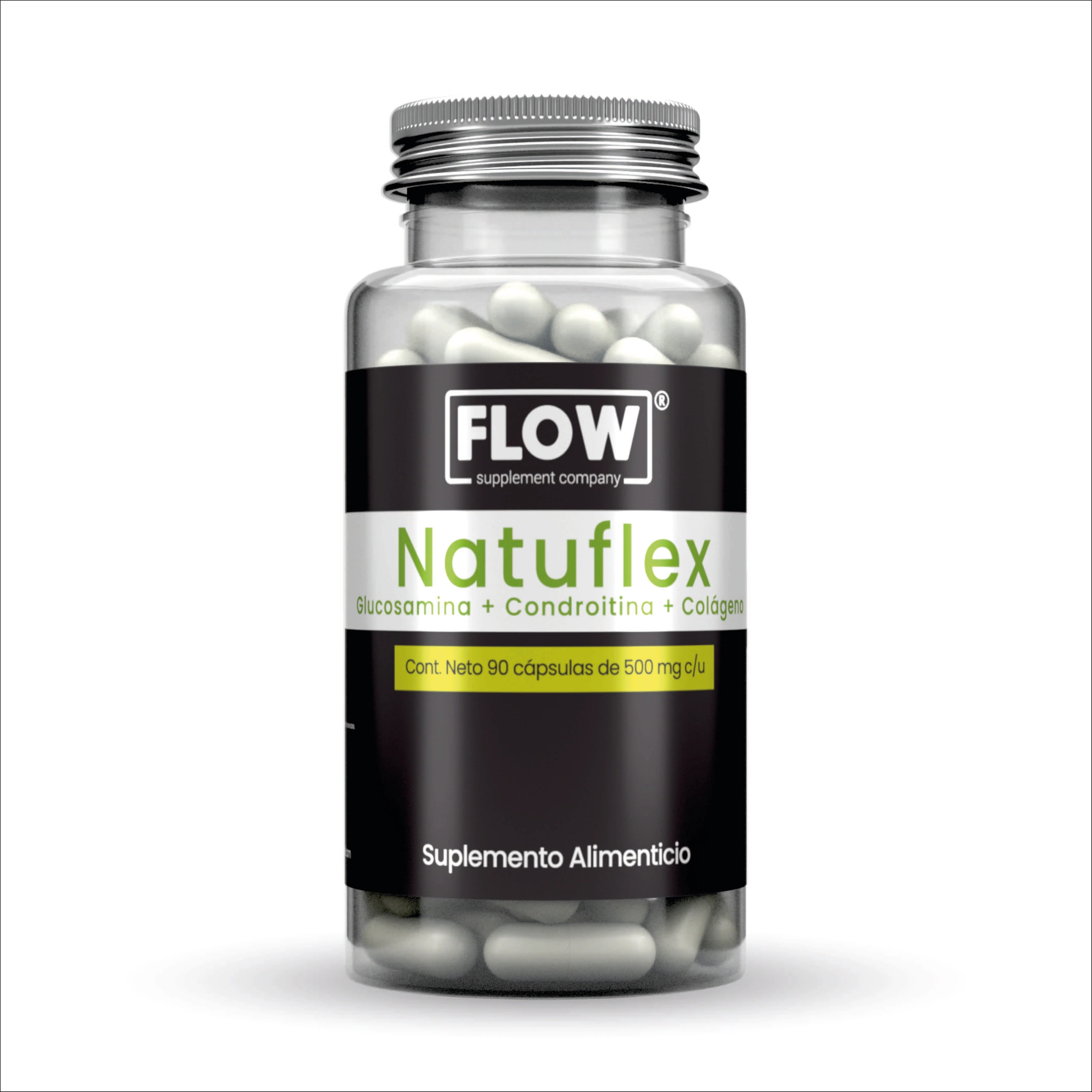 Colágeno, Glucosamina, Chondoritina y Msm. Cápsula de gelatina blanda. Presentación de 90 cápsulas. Es libre aditivos y Gluten free.