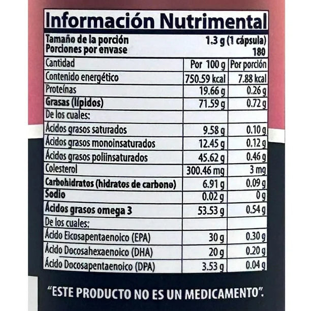 Aceite de Salmón Noruego Omega 3 180 capsulas Natural Health. MODO DE EMPLEO: Tomar una cápsula 3 veces al día. INGREDIENTES: Aceite de Salmon Omega 3 - 0.54 g por porción. EPA - 0.30 g por porción DHA - 0.20 g por porción DPA - 0.04 g por porción EL CONSUMO DE ESTE PRODUCTO ES RESPONSABILIDAD DE QUIEN LO USA Y DE QUIEN LO RECOMIENDA. ESTE PRODUCTO NO ES UN MEDICAMENTO. Cuida lo que comes, haz ejercicio, evita el alcohol.