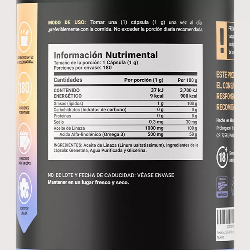 ¡Descubre el bienestar con Omega 3 Flaxseed Oil B Life®! Nuestra exclusiva formulación aporta 1000 mg de Aceite de Linaza en cada cápsula, en comparación con otras presentaciones que ofrecen 300 mg. Cada porción aporta Ácido Alfa-linolénico (Omega 3), componente valioso para ti. Un solo frasco de 180 cápsulas te proporcionará un suministro de hasta 6 meses, consumiendo 1 cápsula al día, de acuerdo al modo de uso indicado.
