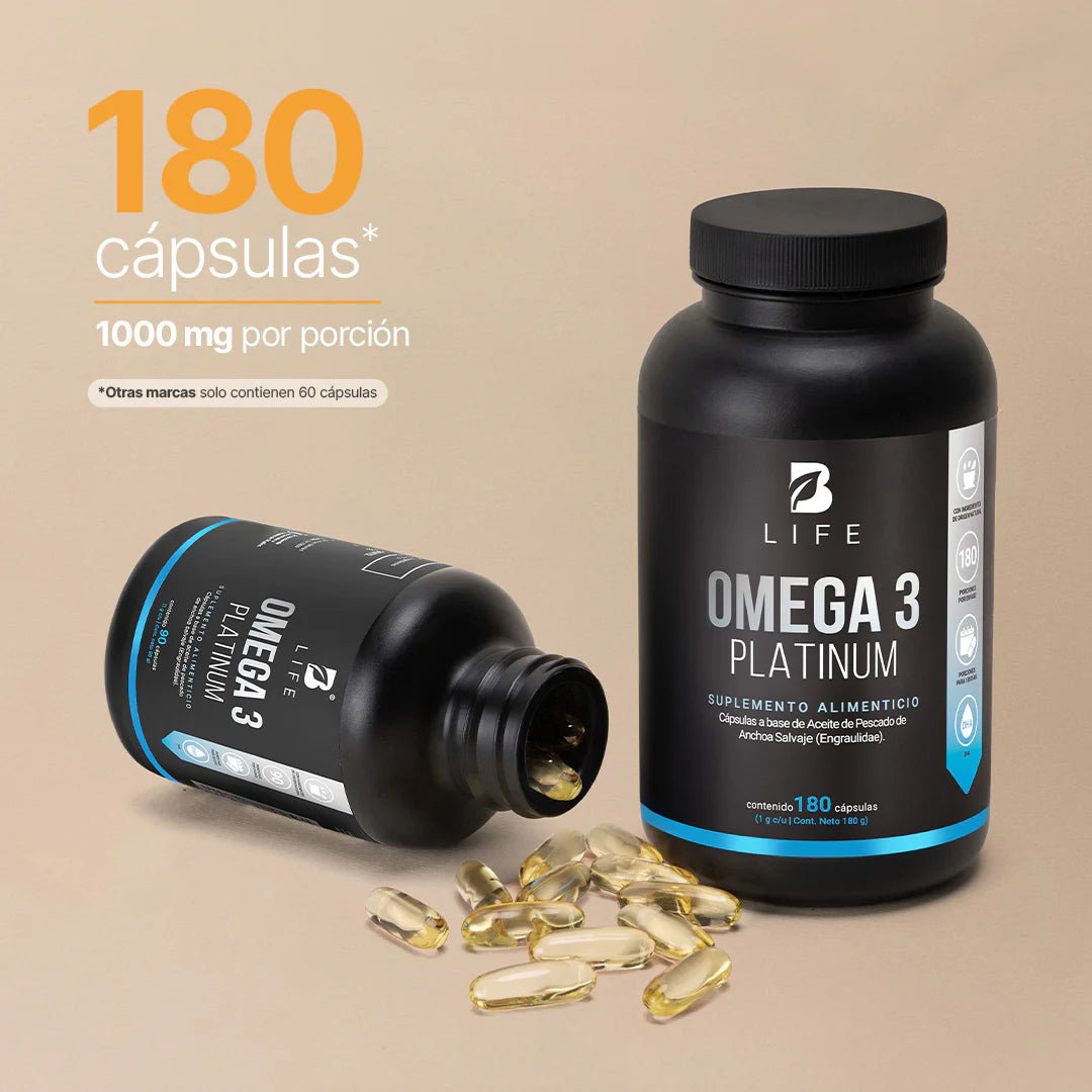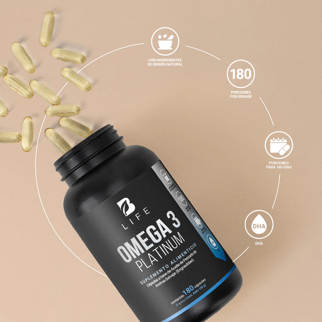¡Descubre el bienestar con Omega 3 Platinum B Life®! Nuestra exclusiva mezcla esta diseñada a base de una poderosa concentración de 1000 mg de Aceite de Anchoa Salvaje; libre de metales pesados, en comparación con otras fórmulas que sí contienen estos ingredientes nocivos.