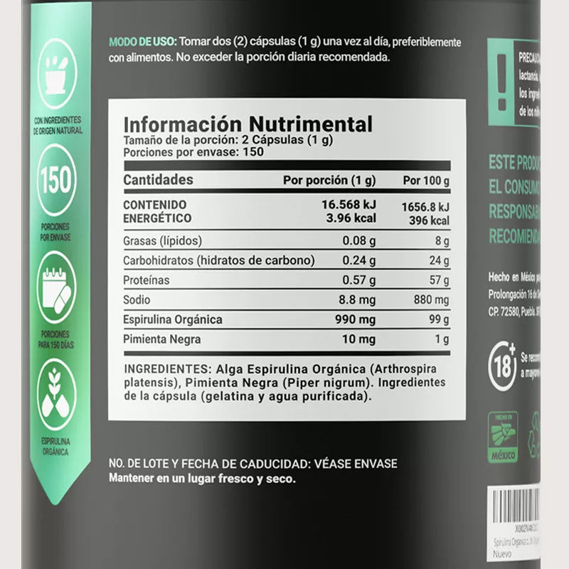 ¡Disfruta la formulación de Organic Spirulina B Life®! Cada cápsula de 500 mg contiene una composición extraordinaria a base de Espirulina orgánica, enriquecida con Pimienta negra, un ingrediente que potencia la absorción de nutrientes, como proteínas, vitaminas, minerales y antioxidantes presentes en la Espirulina, a diferencia de otras presentaciones que carecen de este beneficio.