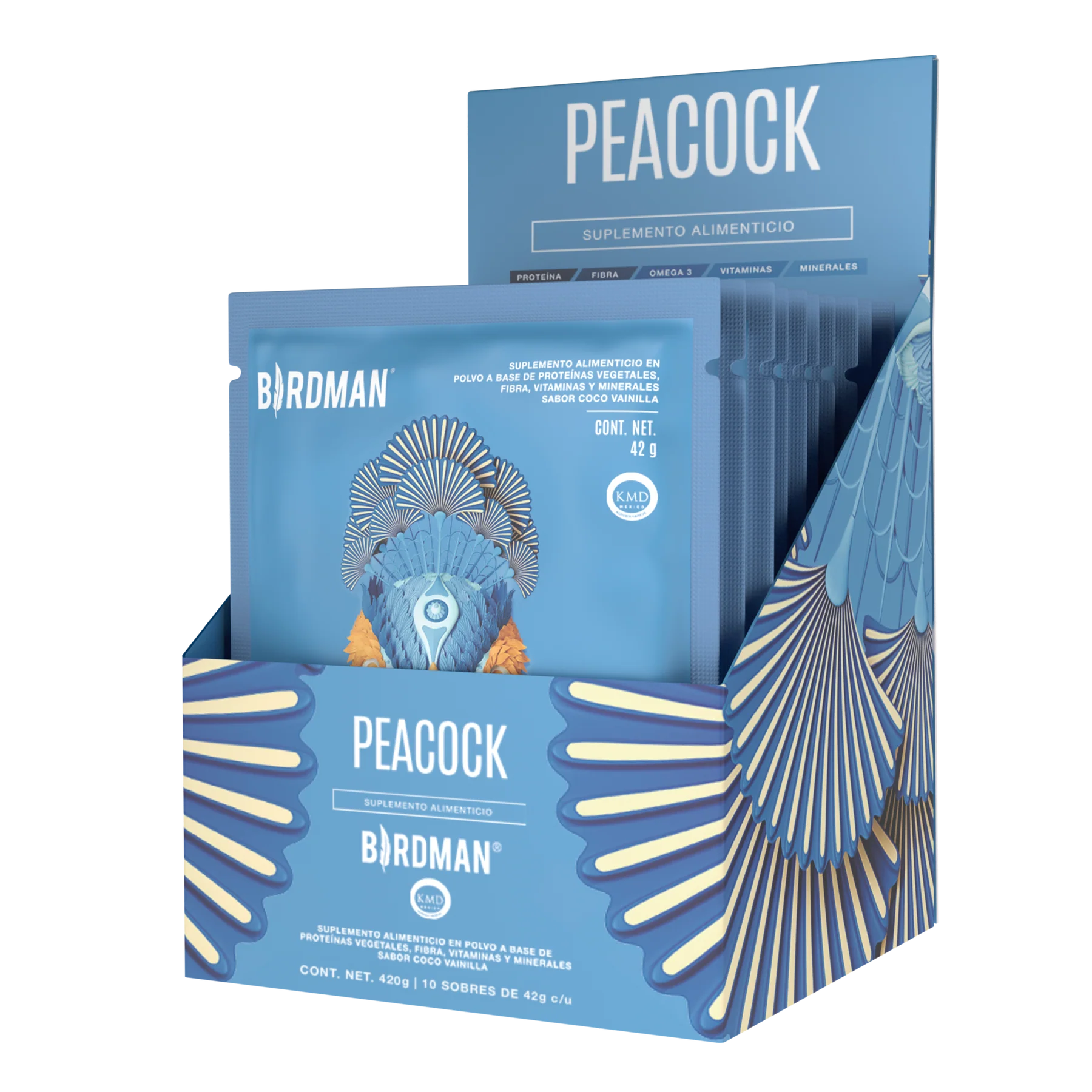 Con Peacock buscamos aportar los macronutrientes típicos de una dieta alta en proteína y los micronutrientes que te ayudarán a complementar tu alimentación para llevar una dieta saludable. Peacock aporta especialmente aquellos nutrientes que tienden a hacer falta en personas que siguen una dieta basada en plantas como Vitamina B-12, Vitamina D y ácidos grasos Omegas 3 y 6. Contiene proteína vegetal con un perfil de aminoácidos completo, verdes/vegetales, fibra, vitaminas, minerales y enzimas. Peacock es un suplemento que ofrece lo mejor del reino vegetal. Disponible en delicioso sabor chocolate y coco-vanilla.