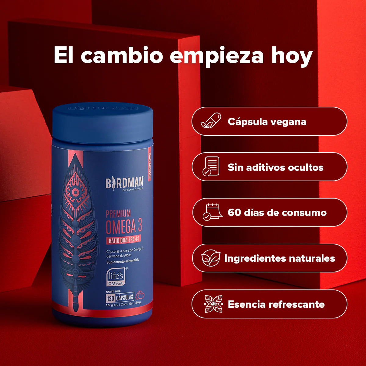 Descubre Birdman Premium Omega 3, un suplemento alimenticio derivado exclusivamente de algas con una proporción óptima DHA:EPA de 4:1. Diseñado para complementar tu alimentación diaria, esta fórmula de origen vegetal es una solución limpia, libre de contaminantes y sostenible, ideal para quienes buscan resultados efectivos y responsables.