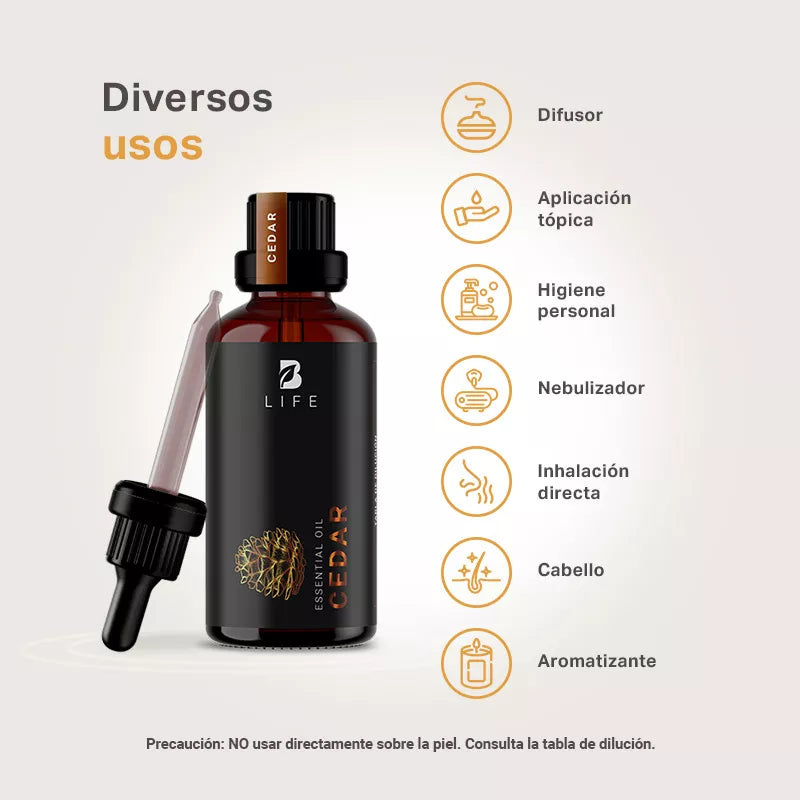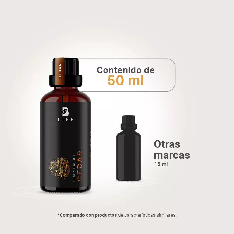 Cedar (Cedro) Essential Oil B Life® es un producto 100% Puro y Natural con numerosas propiedades derivadas de su activo, que ayudan a humectar y nutrir el cabello, a tener un mejor descanso, entre otros. A diferencia de otros productos que solo contienen 10 y 15 ml, Essential Oil contiene 50 ml.