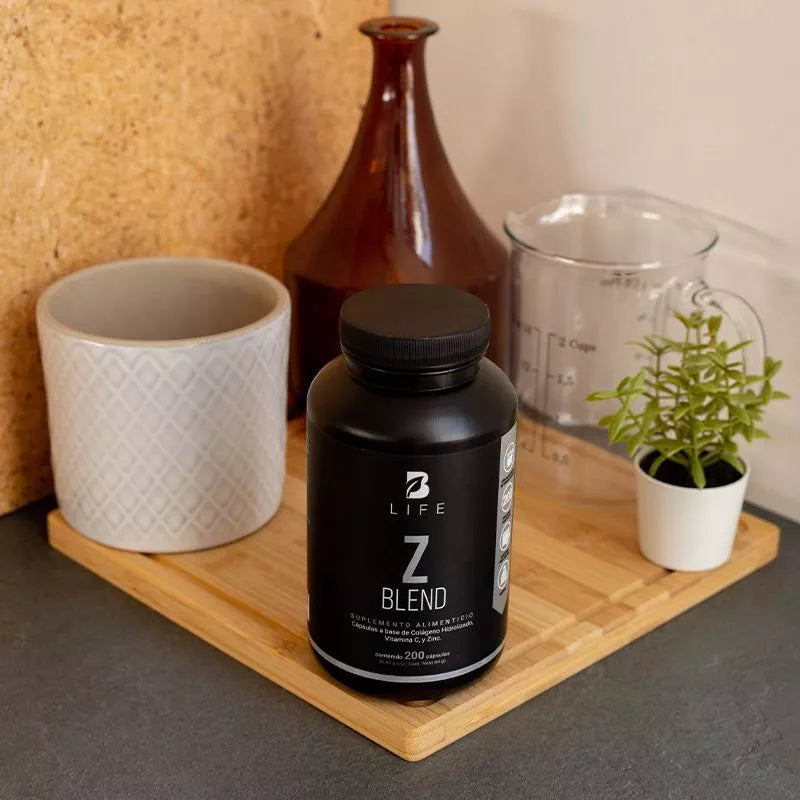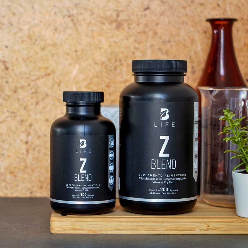 ¡Z Blend B Life®, protección y bienestar en cada porción! Cada cápsula de 420 mg ofrece una composición especial que combina Zinc, Vitamina C y Colágeno, una formulación única que integra minerales, vitaminas y proteínas esenciales para tu vitalidad.
