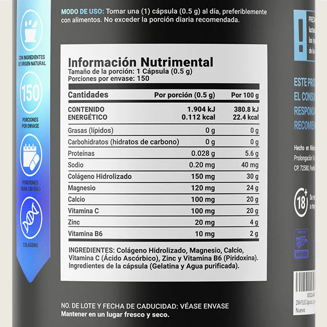 ¡ZMA Blend B Life®, la fórmula completa para tu bienestar diario! Cada cápsula de 500 mg contiene una poderosa combinación de Zinc, Colágeno Hidrolizado, Magnesio, Calcio y Vitaminas C y B6.